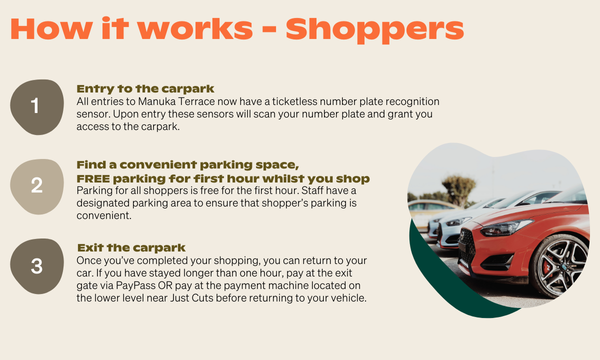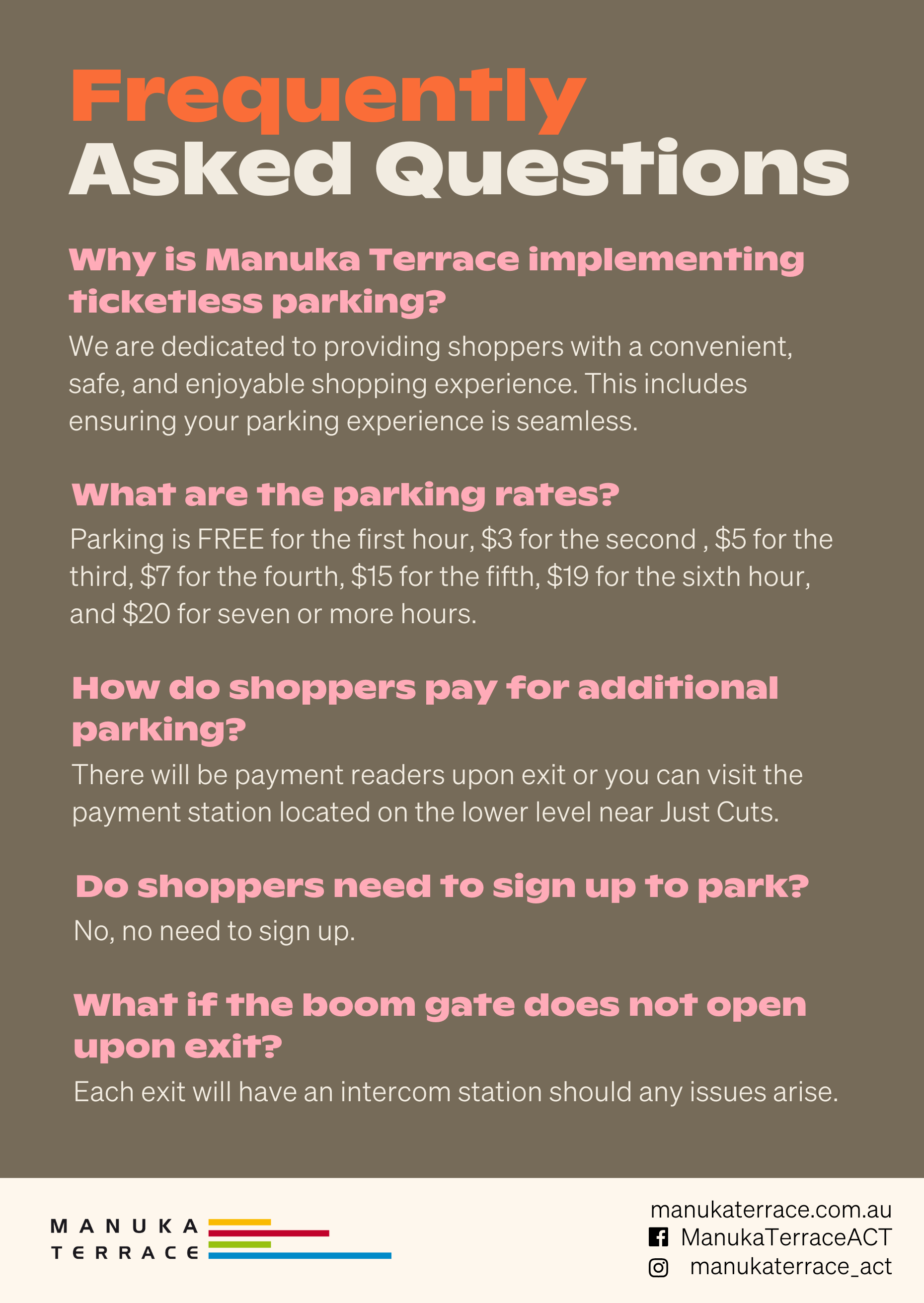 We are confident our new ticketless system will provide a significant improvement to your experience at Manuka Terrace. By ensuring a seamless entry and exit without the need for tickets, combined with our continued offer of 1-hour complimentary parking, you will have ample time to complete your shopping needs.